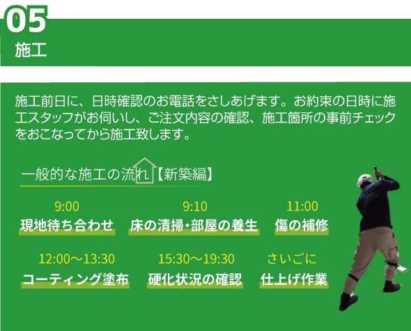 これまでに数多くのご家庭などに施工させていただいた当社のメイン商品で、これから長く付き合っていくご自宅のフローリングを、傷や劣化から長期間保護する事ができます。